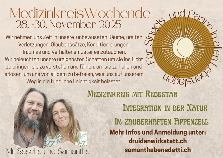 Dieses Wochenende kennt weder ein fixiertes Programm noch eine vorgegebene Struktur... Es kennt lediglich einen, von Sascha und Samantha, gehaltenen Raum indem wir im Medizinkreis mit einem Redestab und unseren +50 Jahren Medizinarbeitswirken wirken und fliessen lassen.